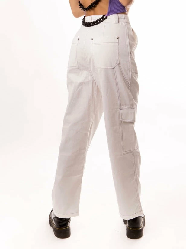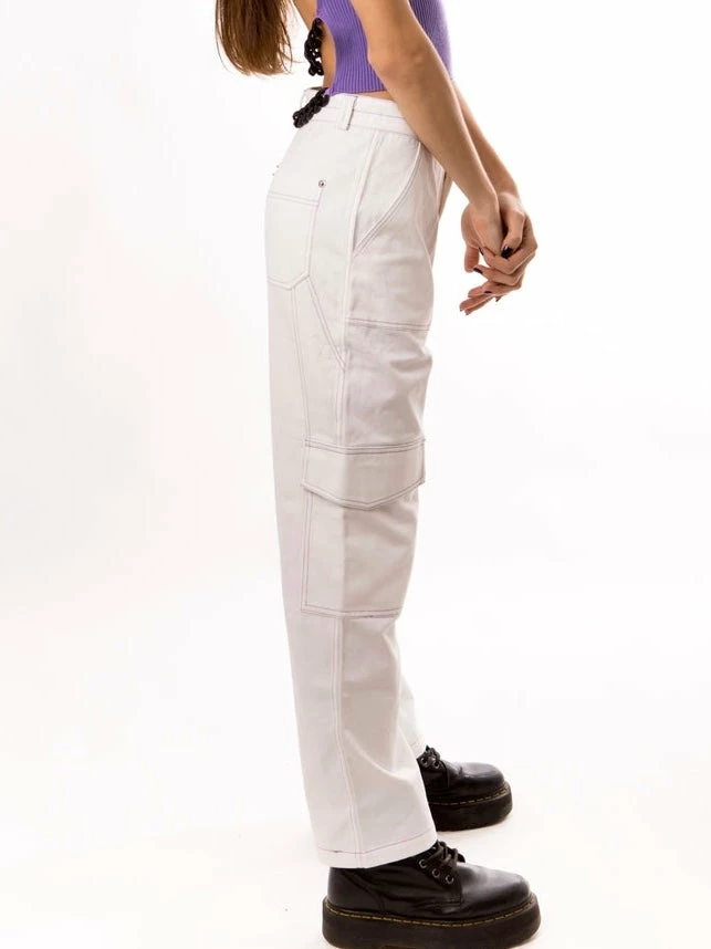 Wide-Leg Denim Cargo Pants in white, purple stitching, front and back pockets.
