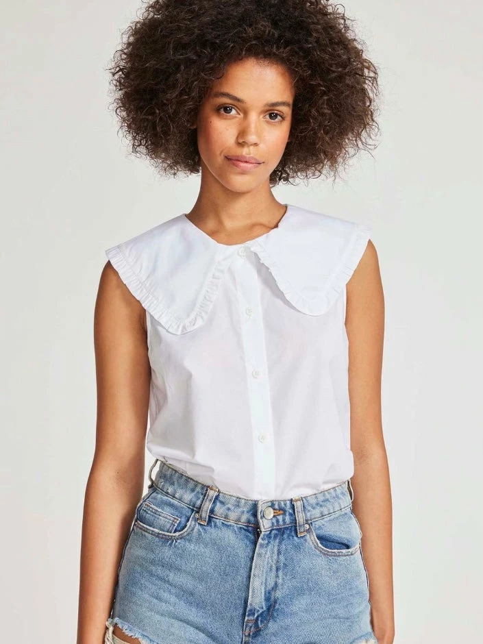 A trendy classic: the Collar ID blouse is sleeveless in solid white. This is the perfect way to wear a popular style all spring and summer.