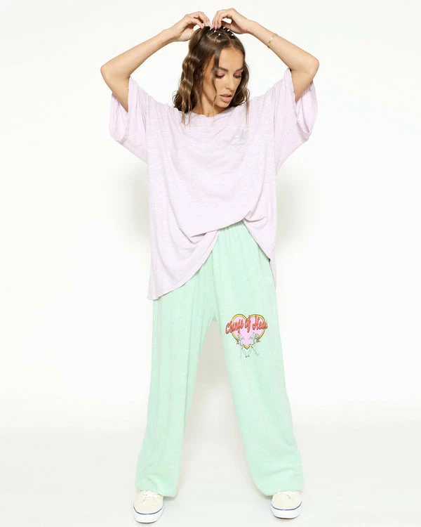 Lightweight terry cloth fabric in mint green. Oversized high rise sweatpants with back and side pockets, elastic waistband and cuffs. Washed for a vintage look and feel.