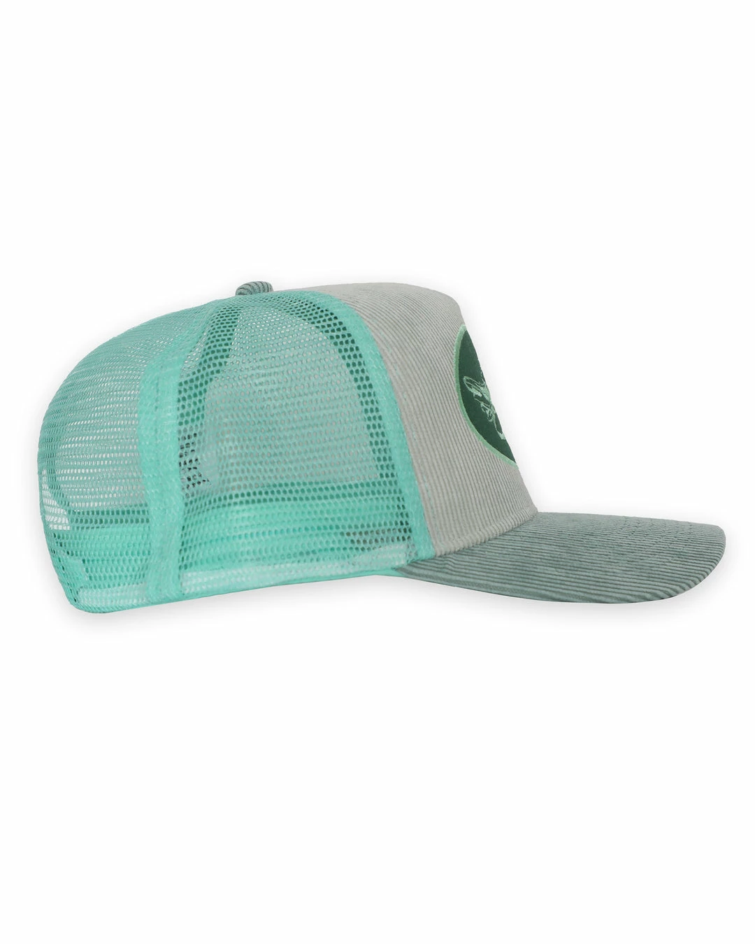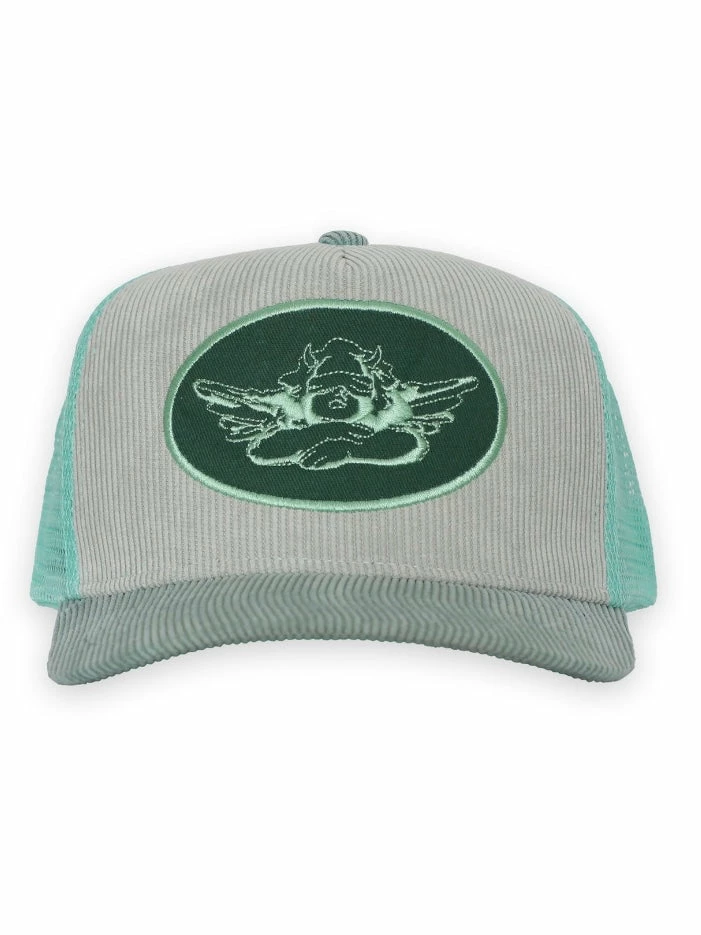 Aquamarine trucker hat with green patch and pale blue/grey corduroy.