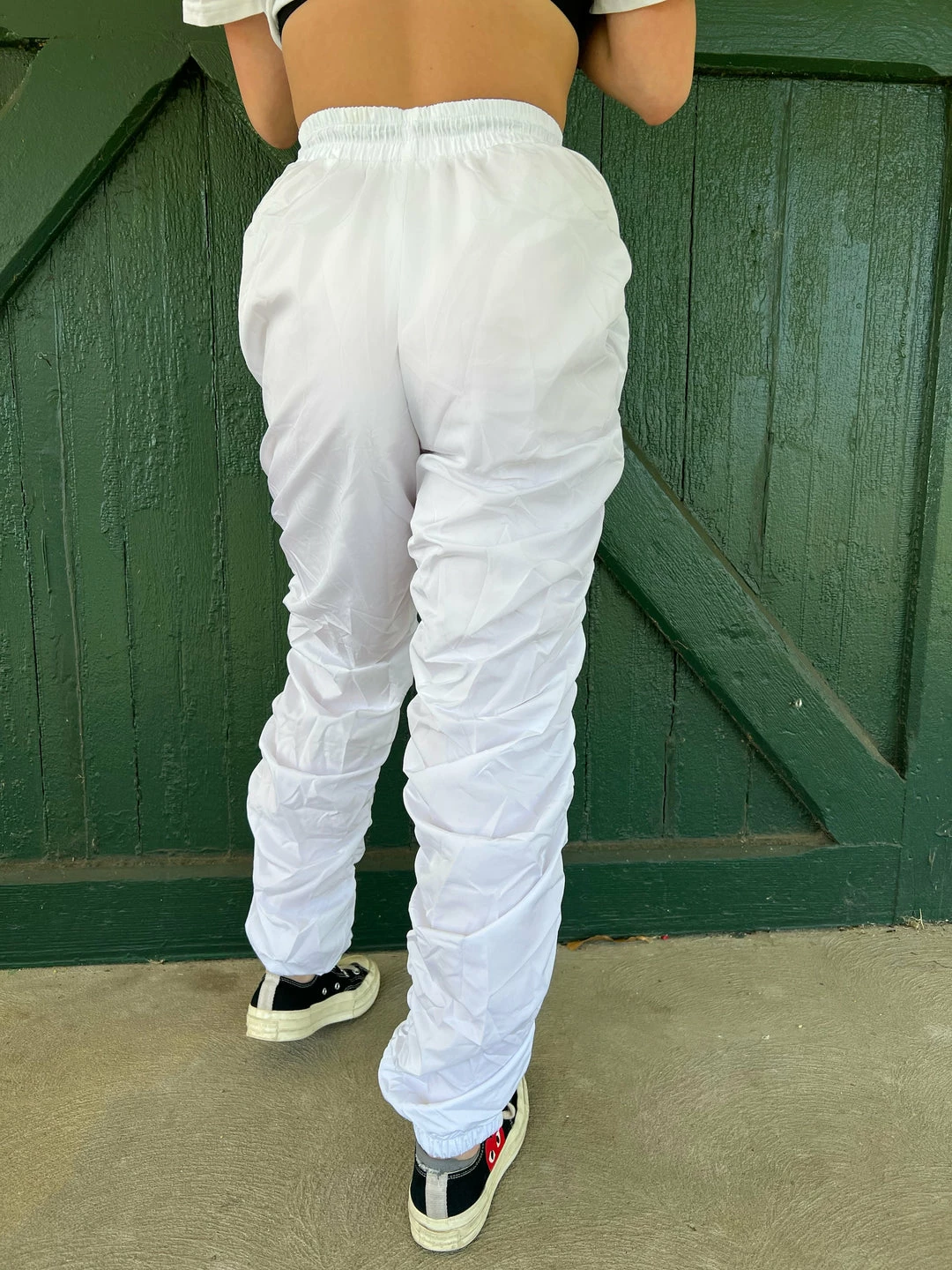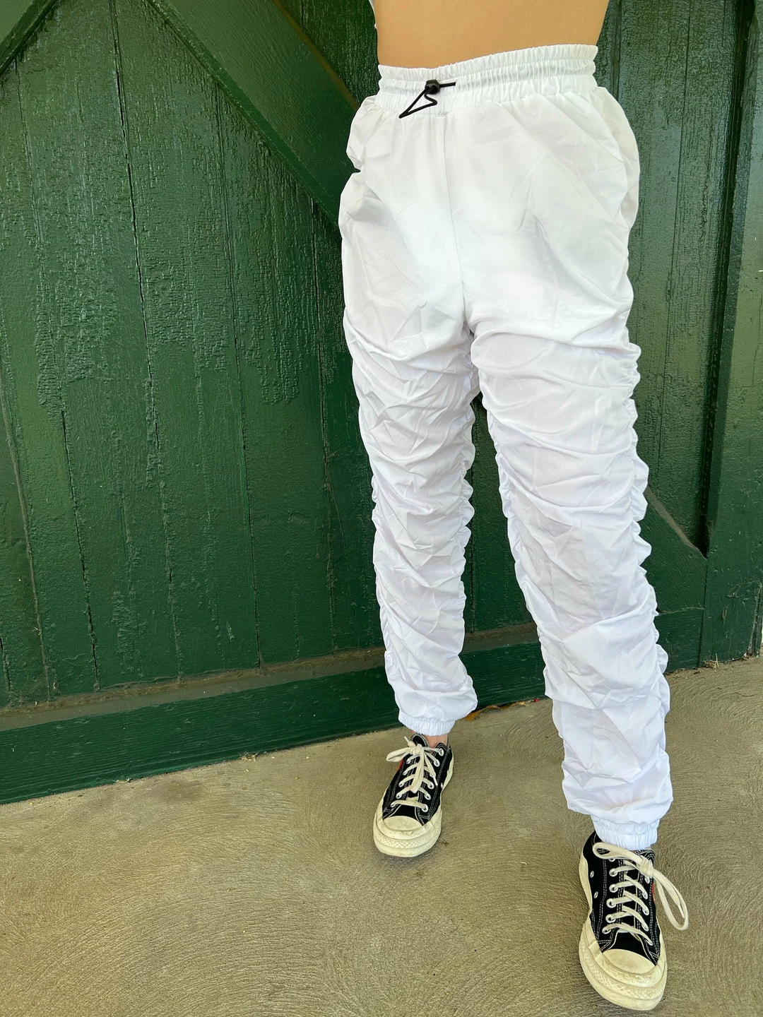 Ruched Pants have a knit construction, a ruched sides, an elastic waistband, with a mid waist fit.