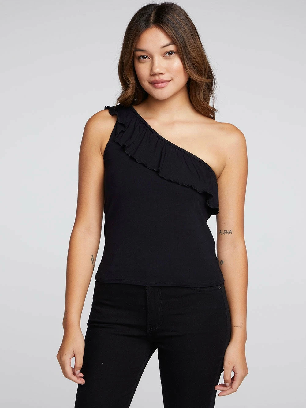 Our Cool Jersey One Shoulder Ruffle Top features imported fabric and some stretch.