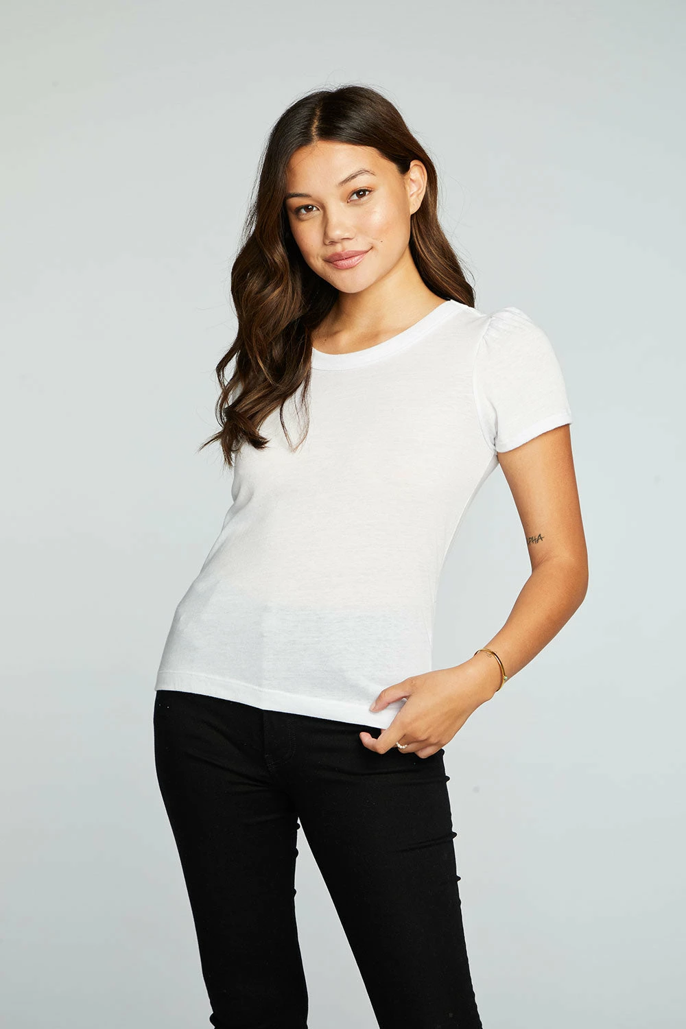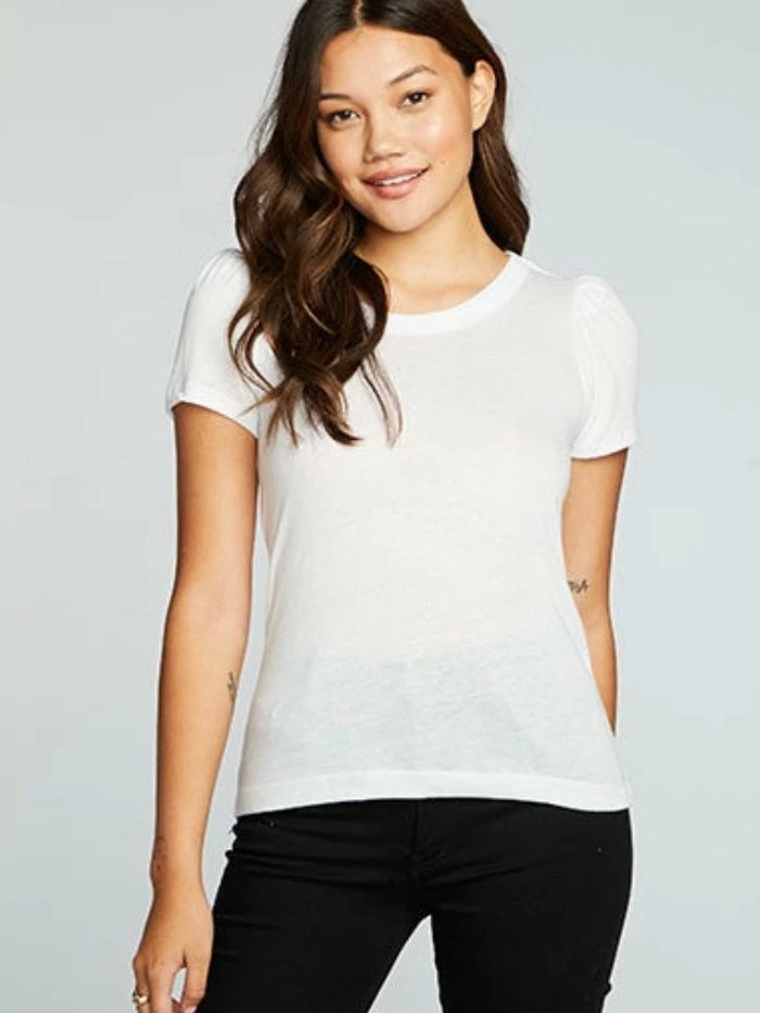 Our Bella Jersey Shirred Puff Sleeve Easy Tee features imported fabric.