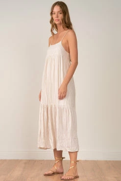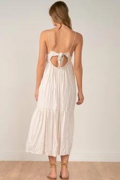 Spaghetti strap taupe stripe tiered maxi dress with tie back.