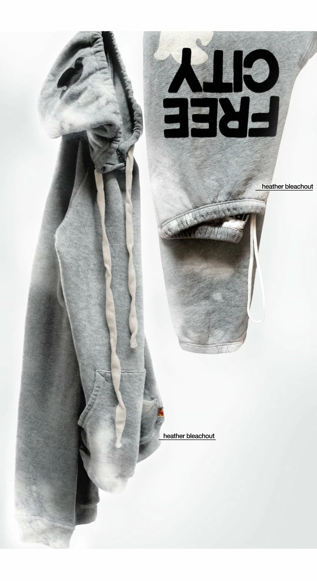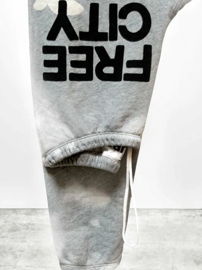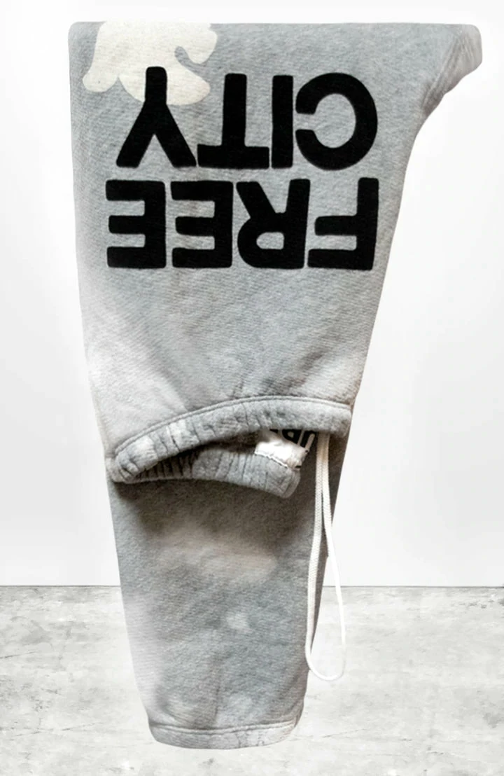 Unisex SUPERBLEACHOUT sweatpant in heather with custom partial hand-bleach process (highs and lows) classic black “FREECITYLARGE” print with cream “FREECITYDOVE,” covered elastic waist with pull drawstring.