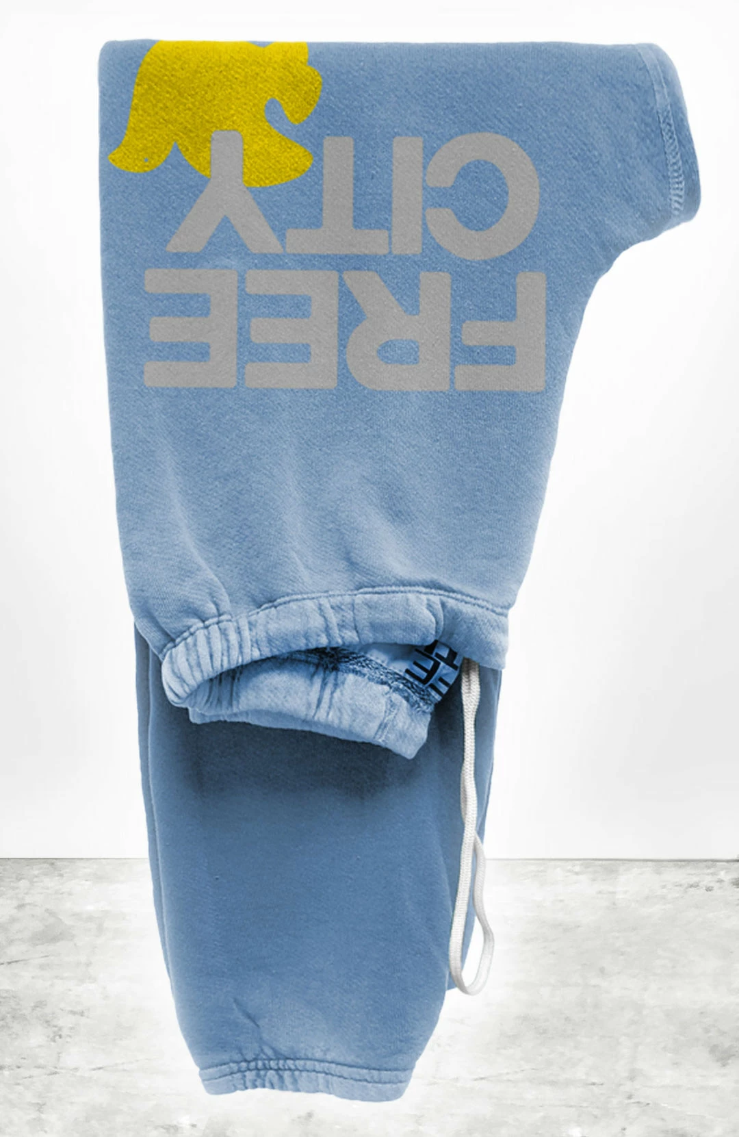 Unisex sweatpant with classic “FREECITYLARGE” print and yellow “DOVE,” covered elastic band and pull drawstring at waist.