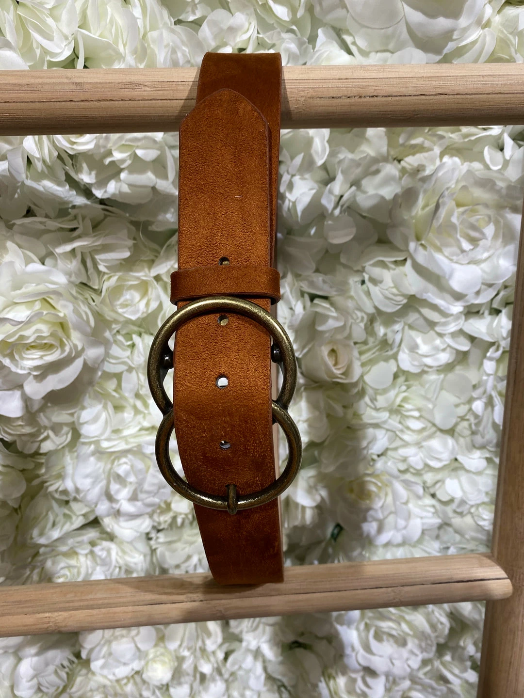 Rust vegan suede belt with aged gold double buckle.