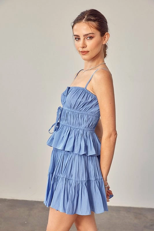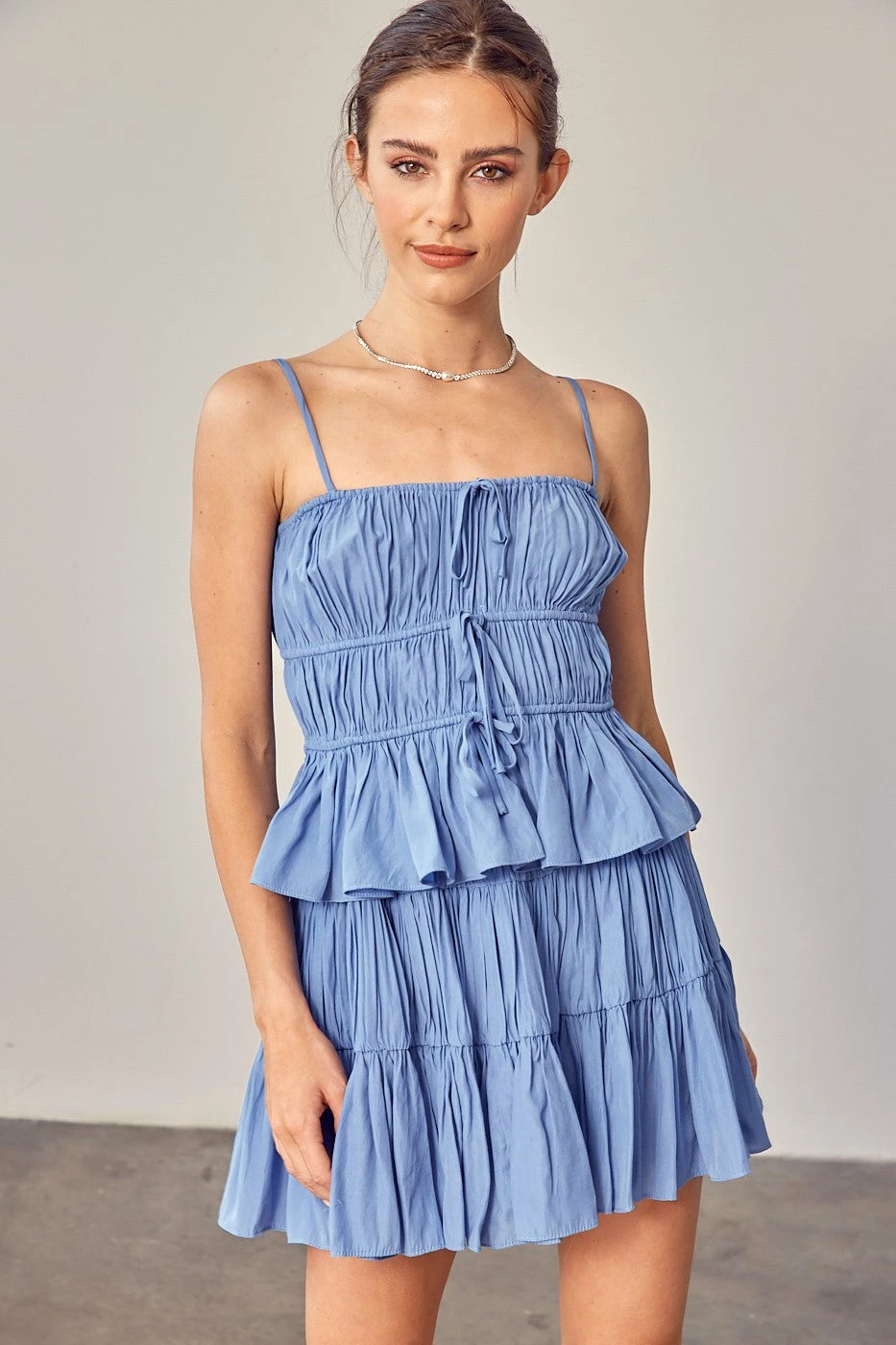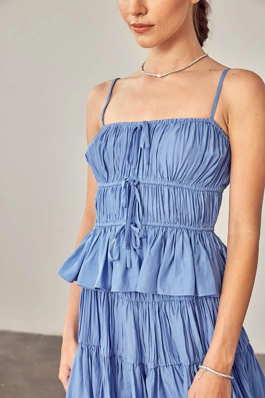 Spaghetti strap ruched top, elastic detail with front tiered ties. Adjustable strapes.