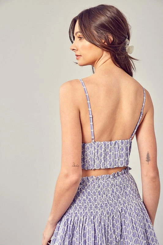 Spaghetti strap crop top. Floral embroidery over stripe pattern. Adjustable straps.