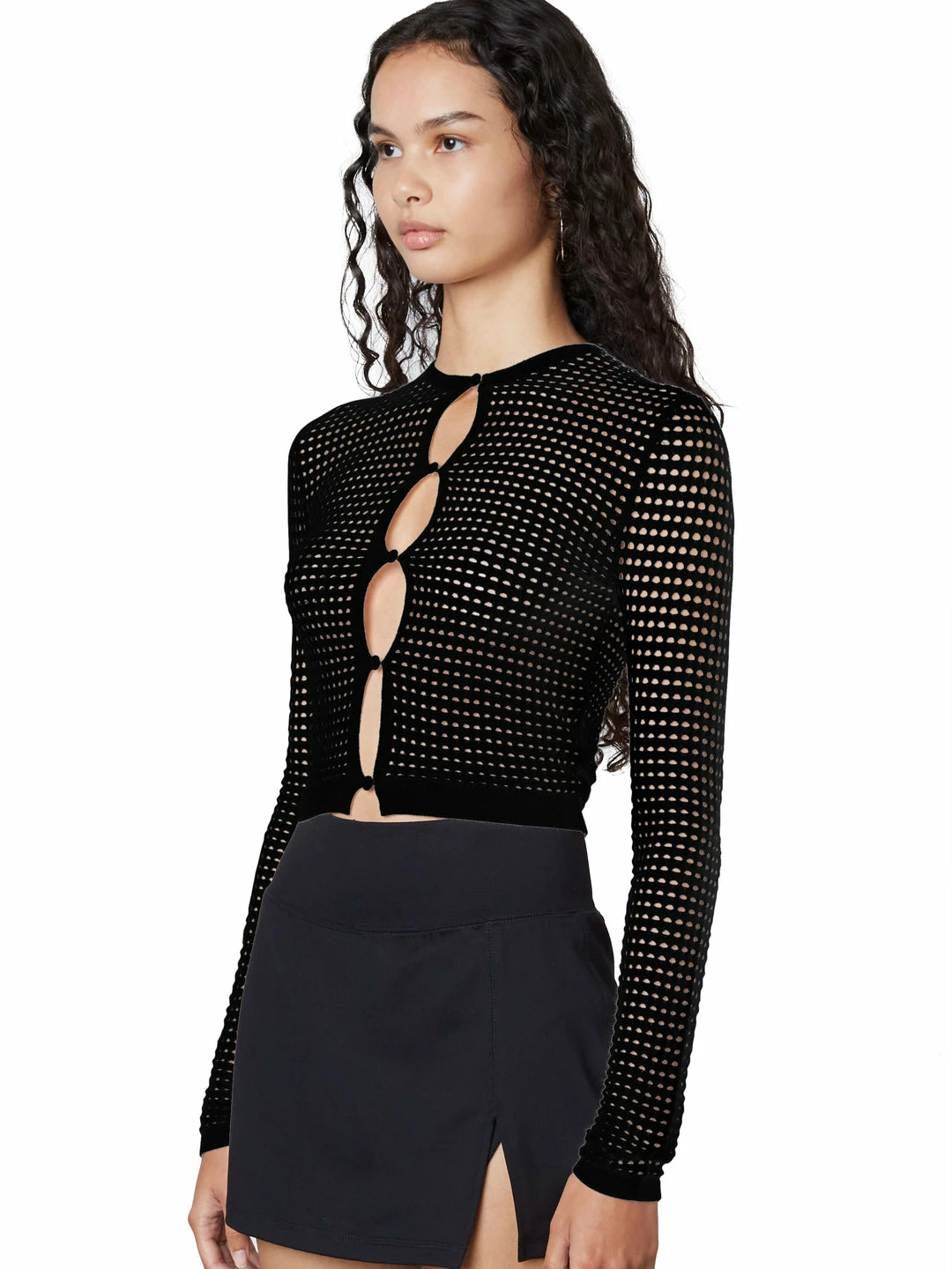 Long sleeve cut out button down placket sweater knit cardigan.