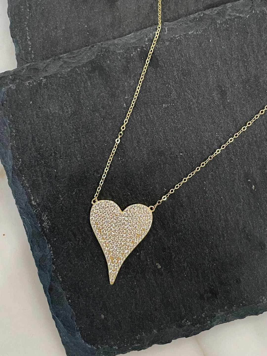 Heart pendant in sterling silver with 14k gold or platinum plating pave set with brilliant cut /cubic zirconia. 16″ chain + 2″ extender. Large heart measures 3/4″ wide and 1″ tall. Spring ring catch.