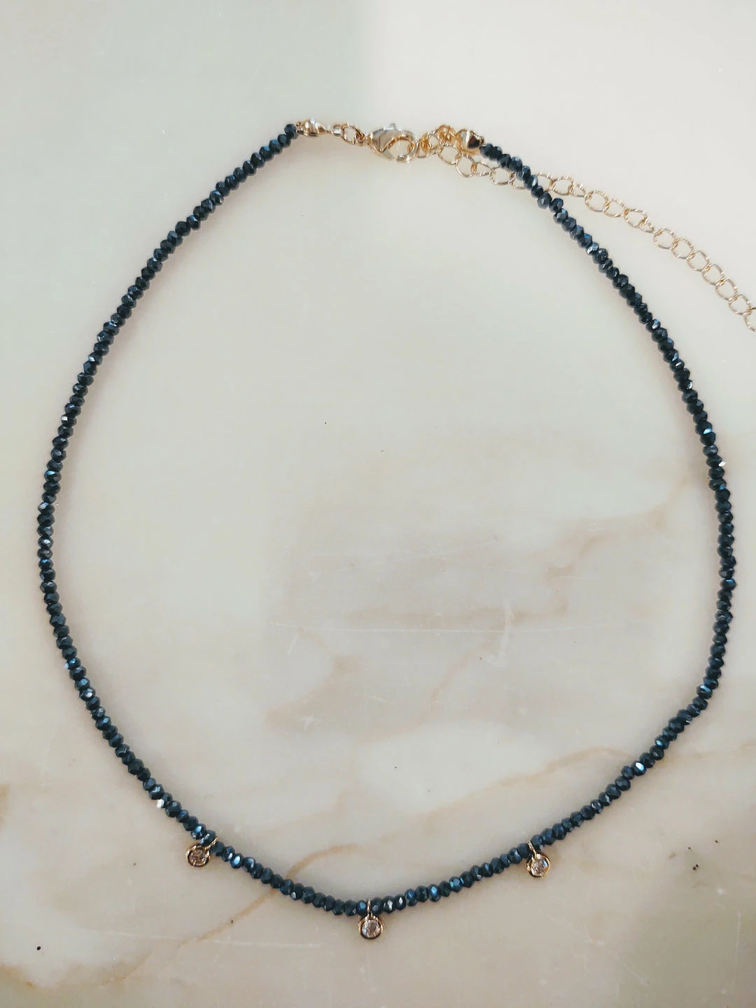 Navy bead choker with 3 dangle bezel cz’s and gold plated brass lobster catch. 13″ + 3″ extender