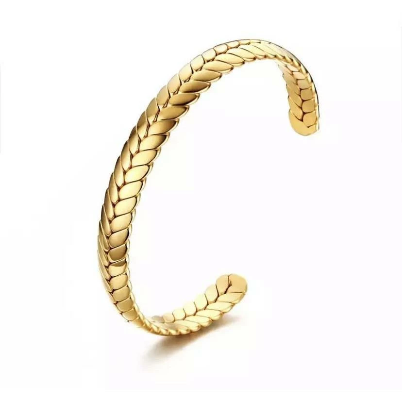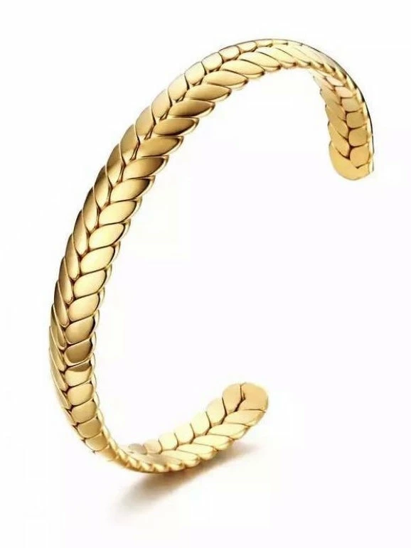 Flat rigid cubal link open bangle bracelet in 18k gold plated stainless steel