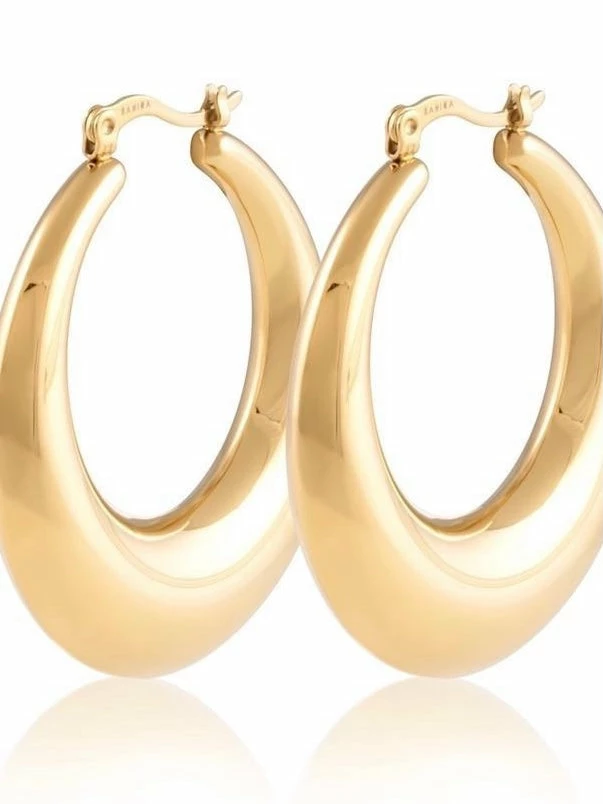 Elevated everyday hoop earrings with sculpted silhouette in 18k gold plated stainless steel. Hollow lightweight feel for comfort