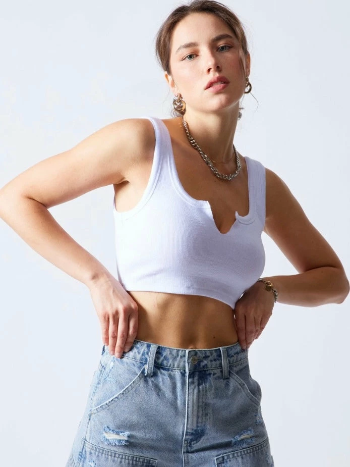 Signature 8 Tops Nola Rib Split Neck White Crop Top