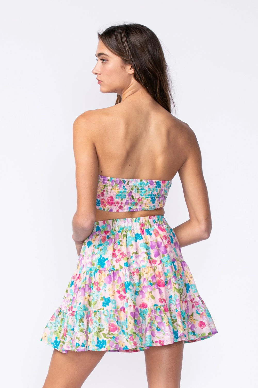 Smocked back tube top twist front detail. Matching pull on tiered mini skirt.