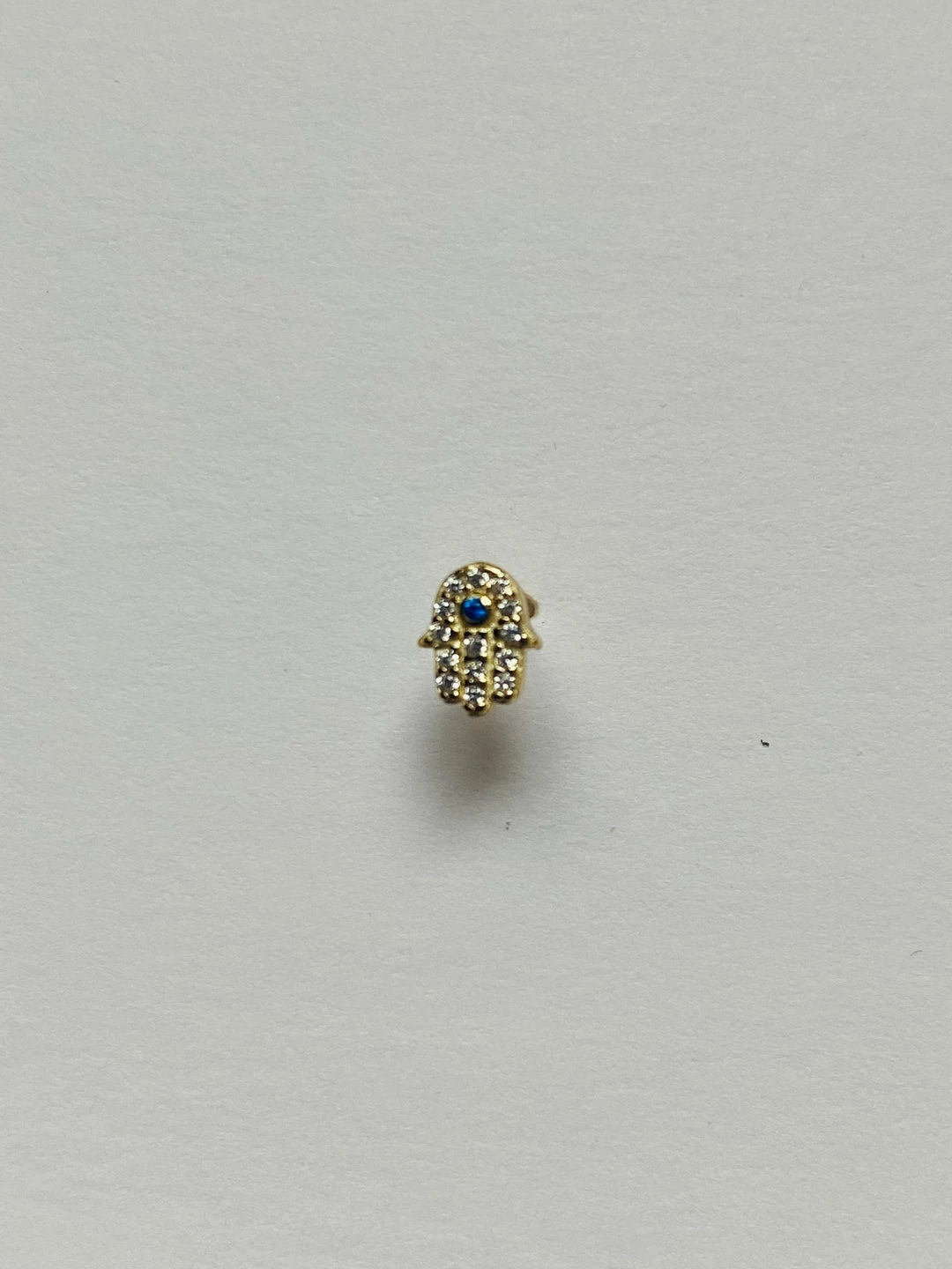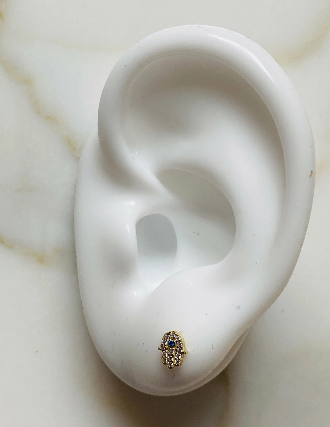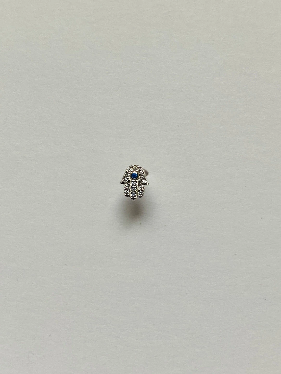 Sterling silver Hamsa earring stud pave set with cubic zirconia. 1/4″ tall 14k gold plate or rhodium plate