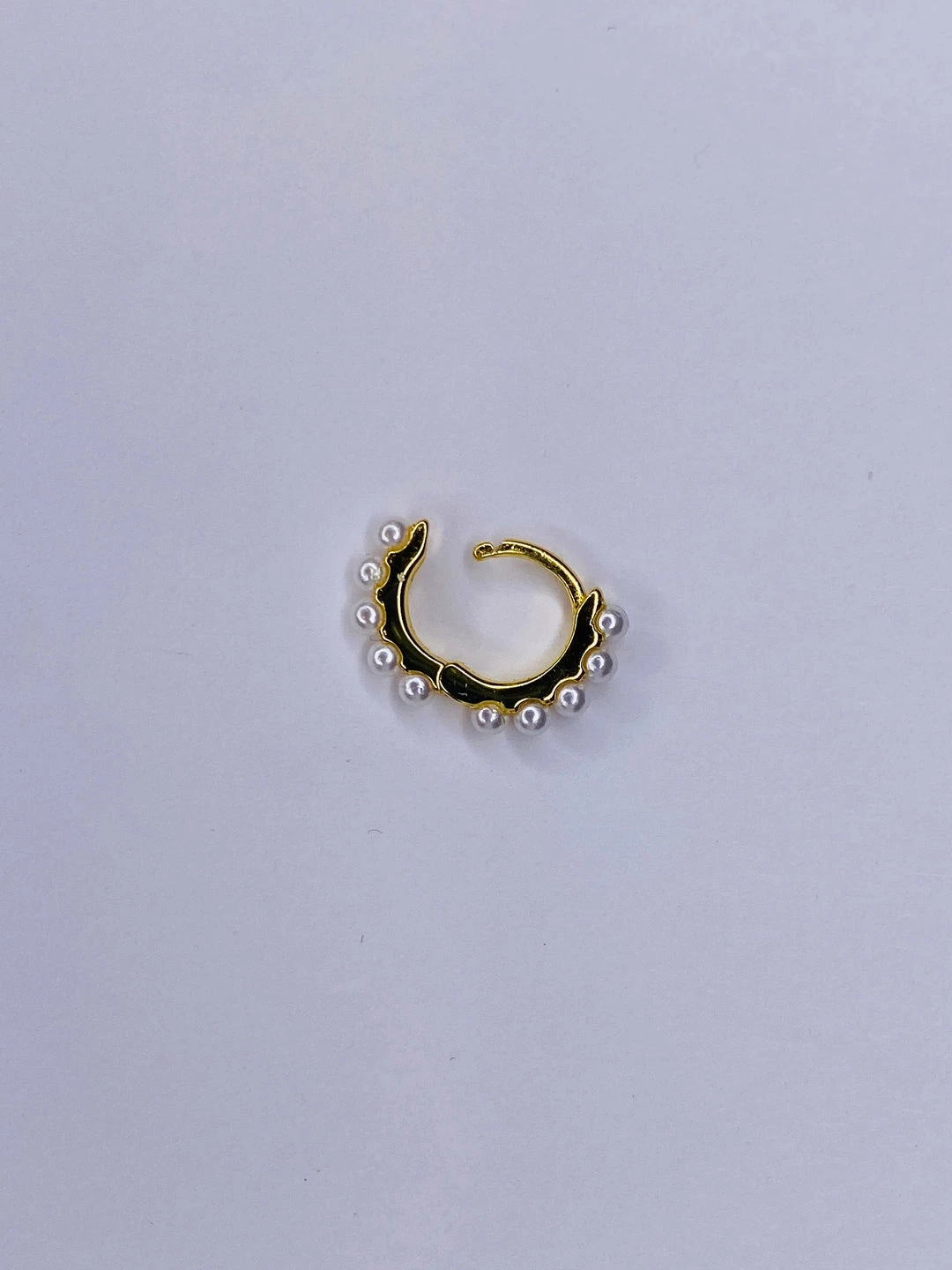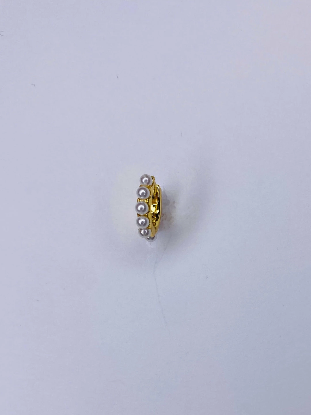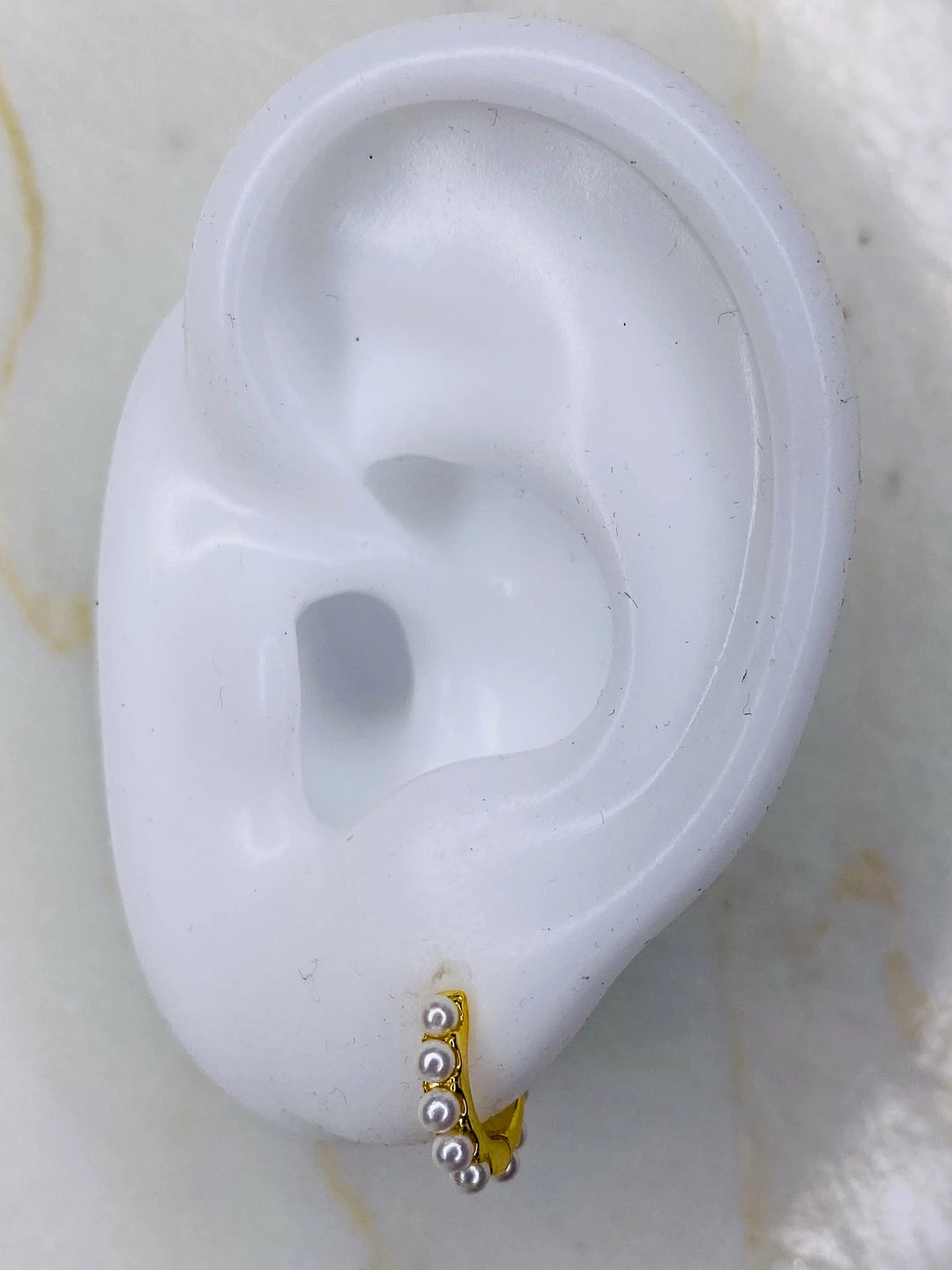 Sterling silver huggy hoop pearl stud. 1/2″ diameter. Hinged for easy on/off. 14k gold plate or rhodium plate