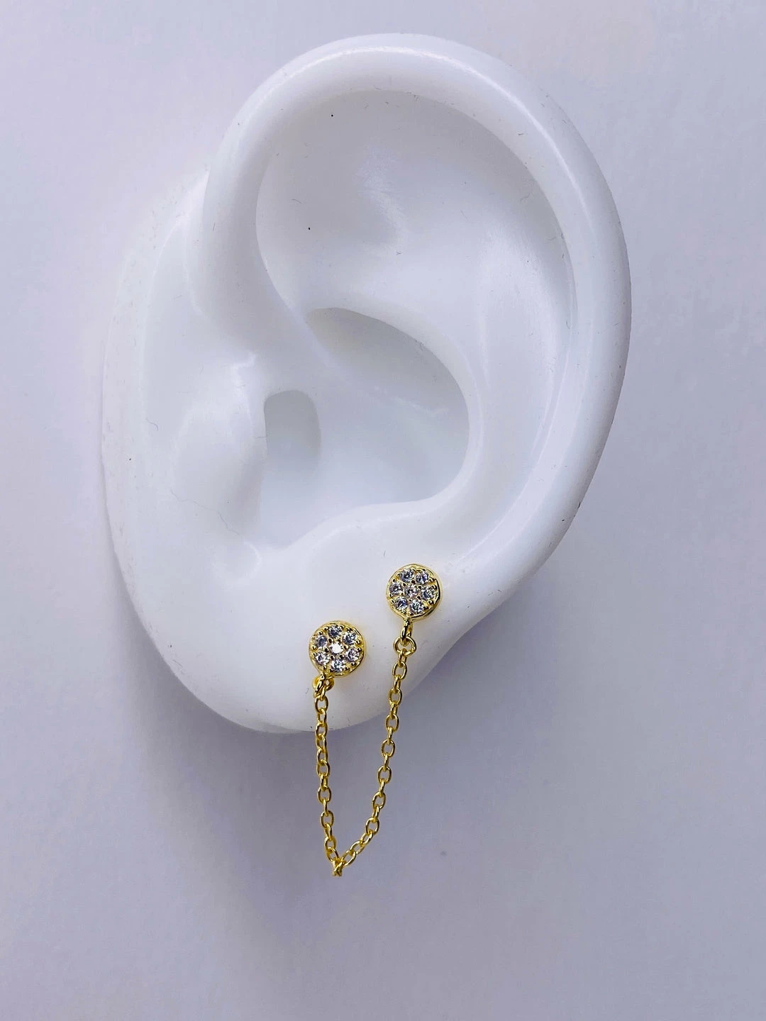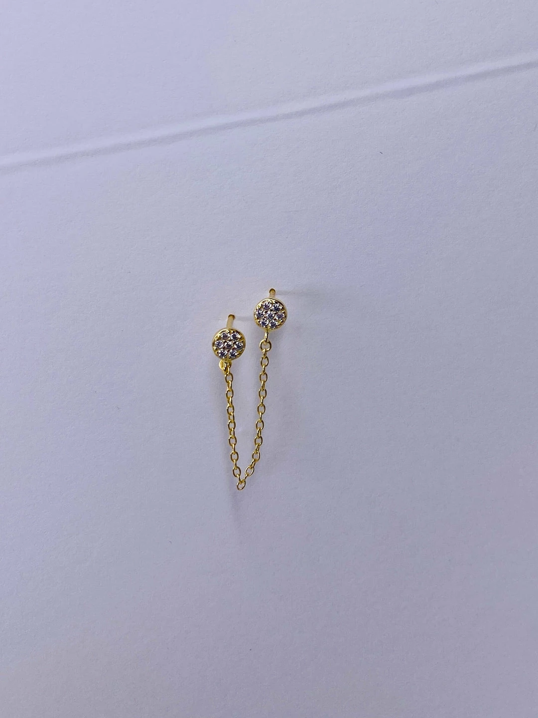 Sterling silver double pave set cz disk earring stud with cable chain connection. 1″ long. 14k gold/rhodium plate.