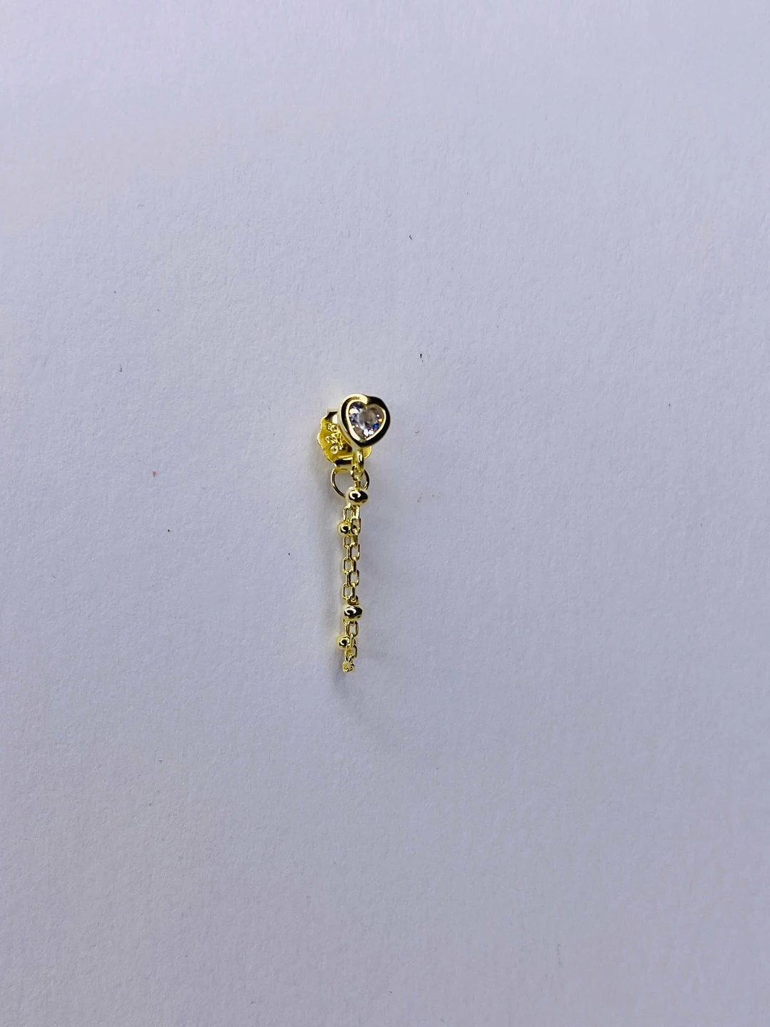 Sterling silver bezel set heart shape cz earring stud with specialty chain detail. 7/8″ long. 14k gold/rhodium plate.