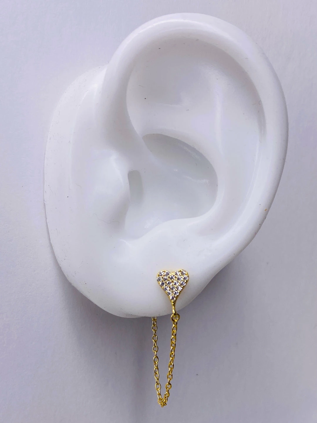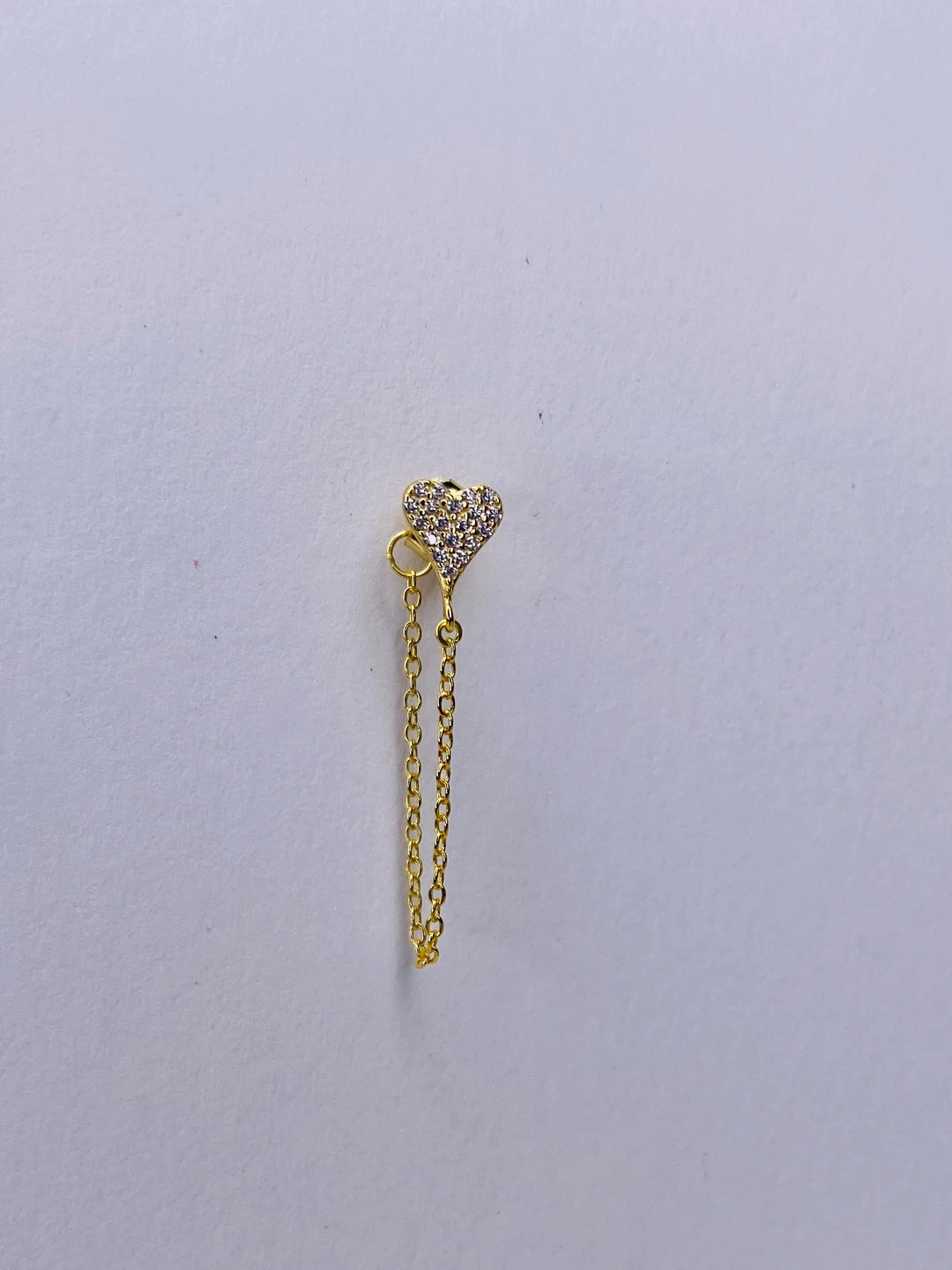 Sterling silver pave set cz heart earring stud with cable chain detail. 1 1/8″ long. 14k gold/rhodium plate.