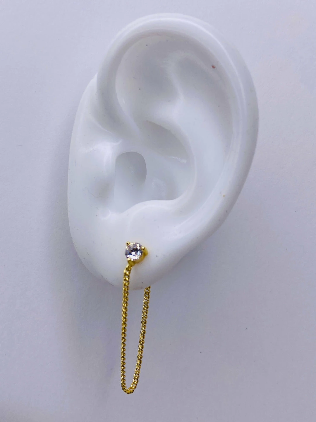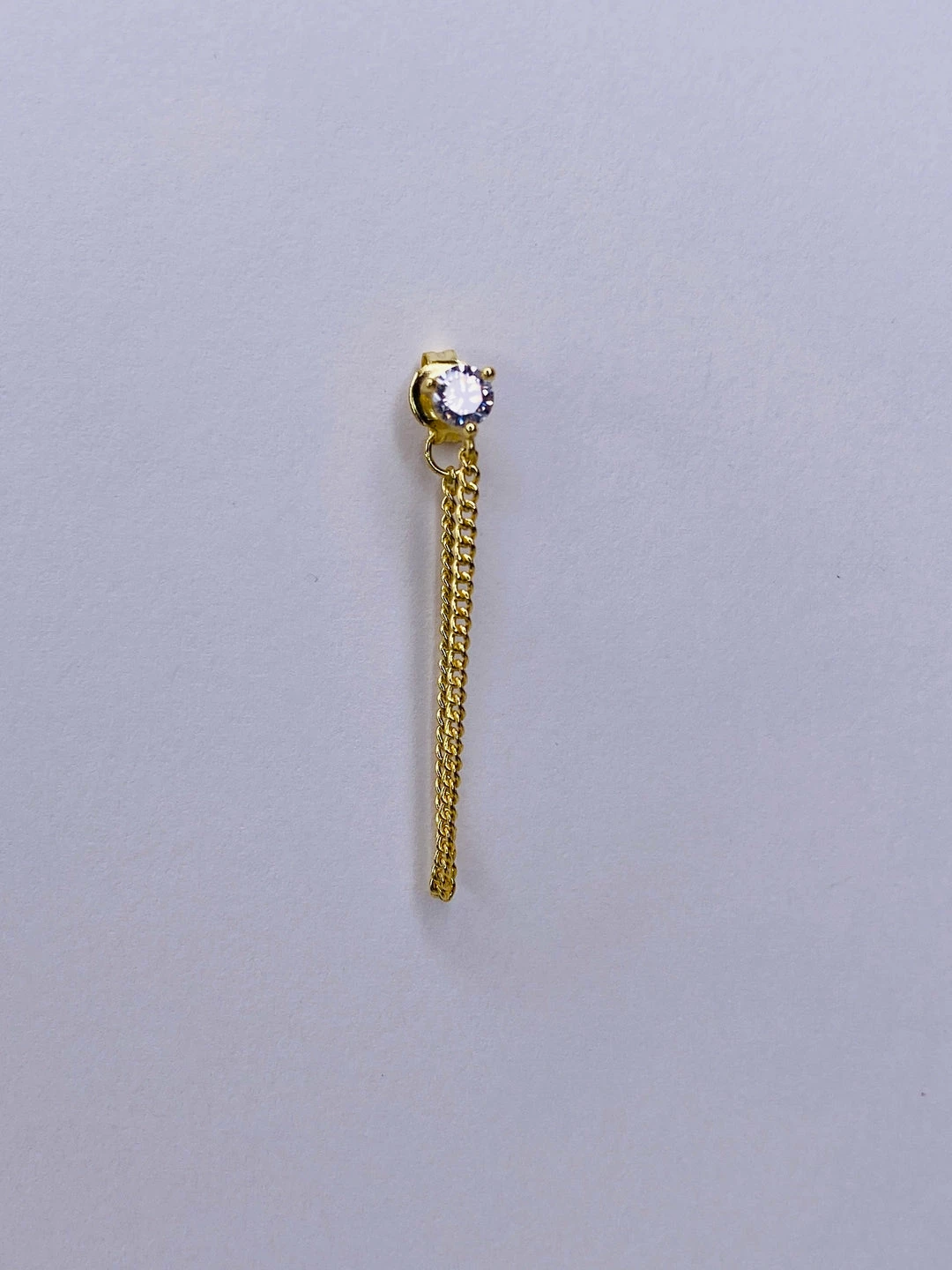Sterling silver earring stud set with with round cubic zirconia with flat curb chain. 1 3/8″ long 14k gold/rhodium plate.