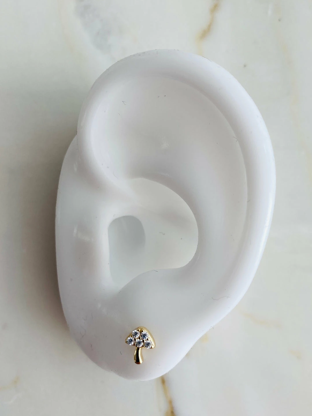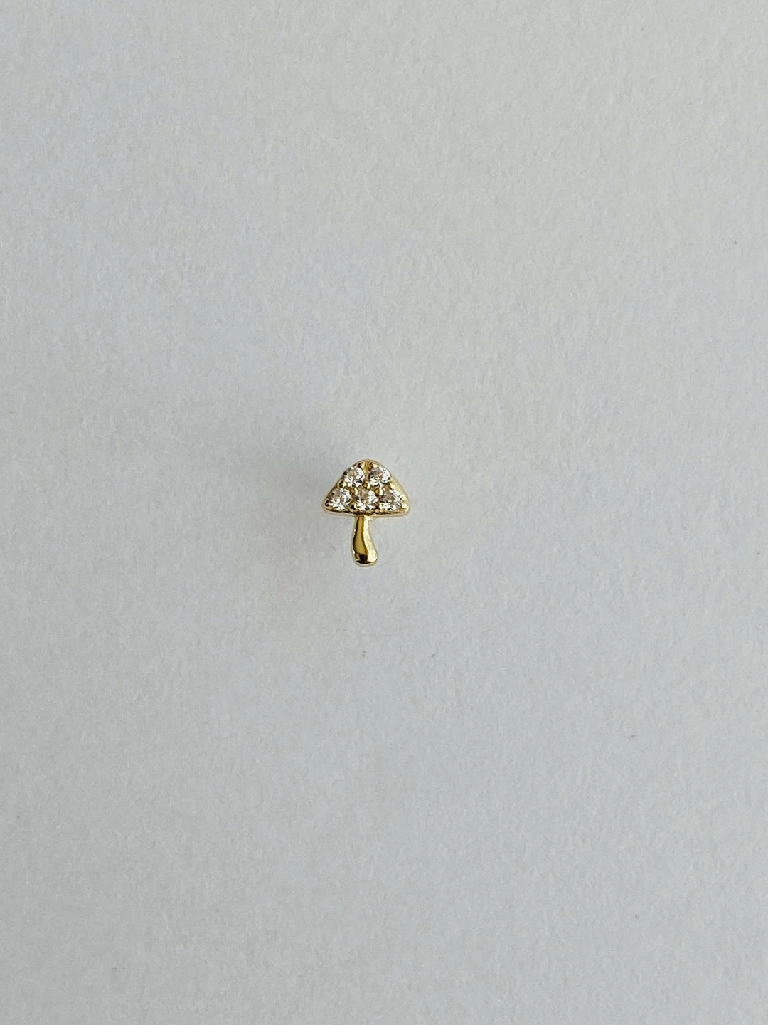 Sterling silver mushroom shape earring stud with pave set cubic zirconia. 1/4″ diameter 14k gold plate or rhodium plate.