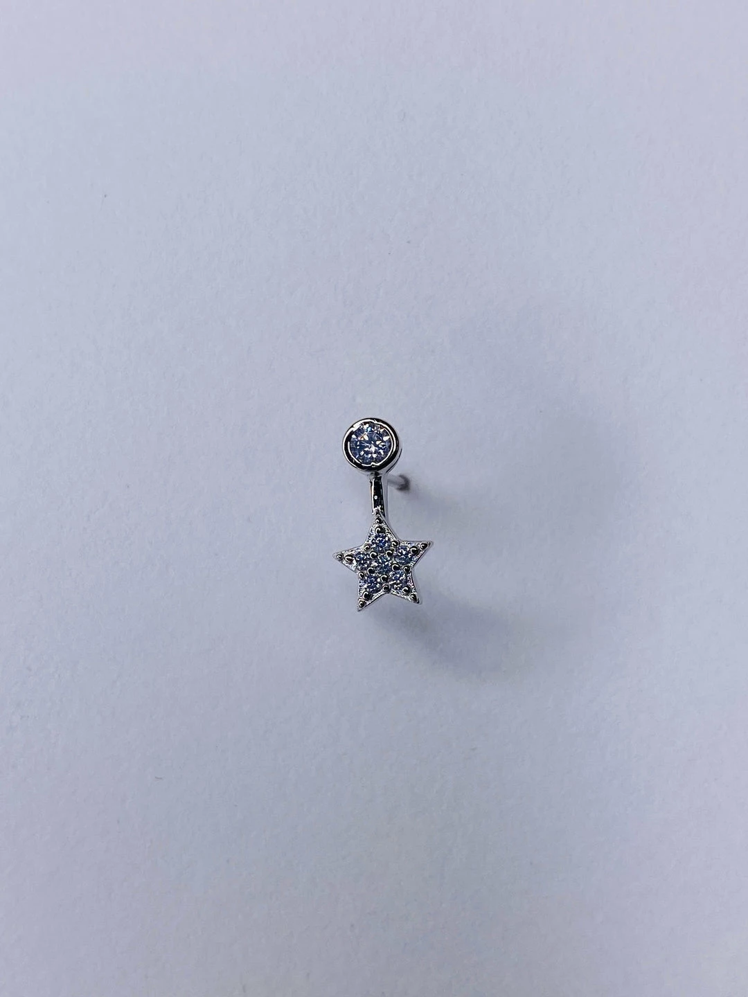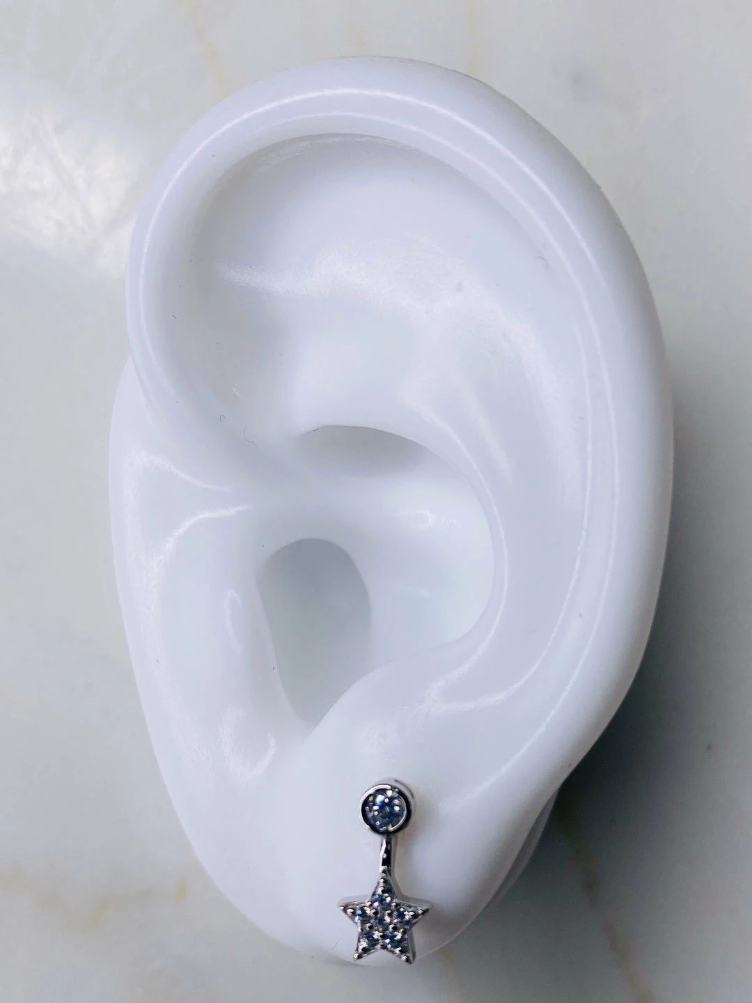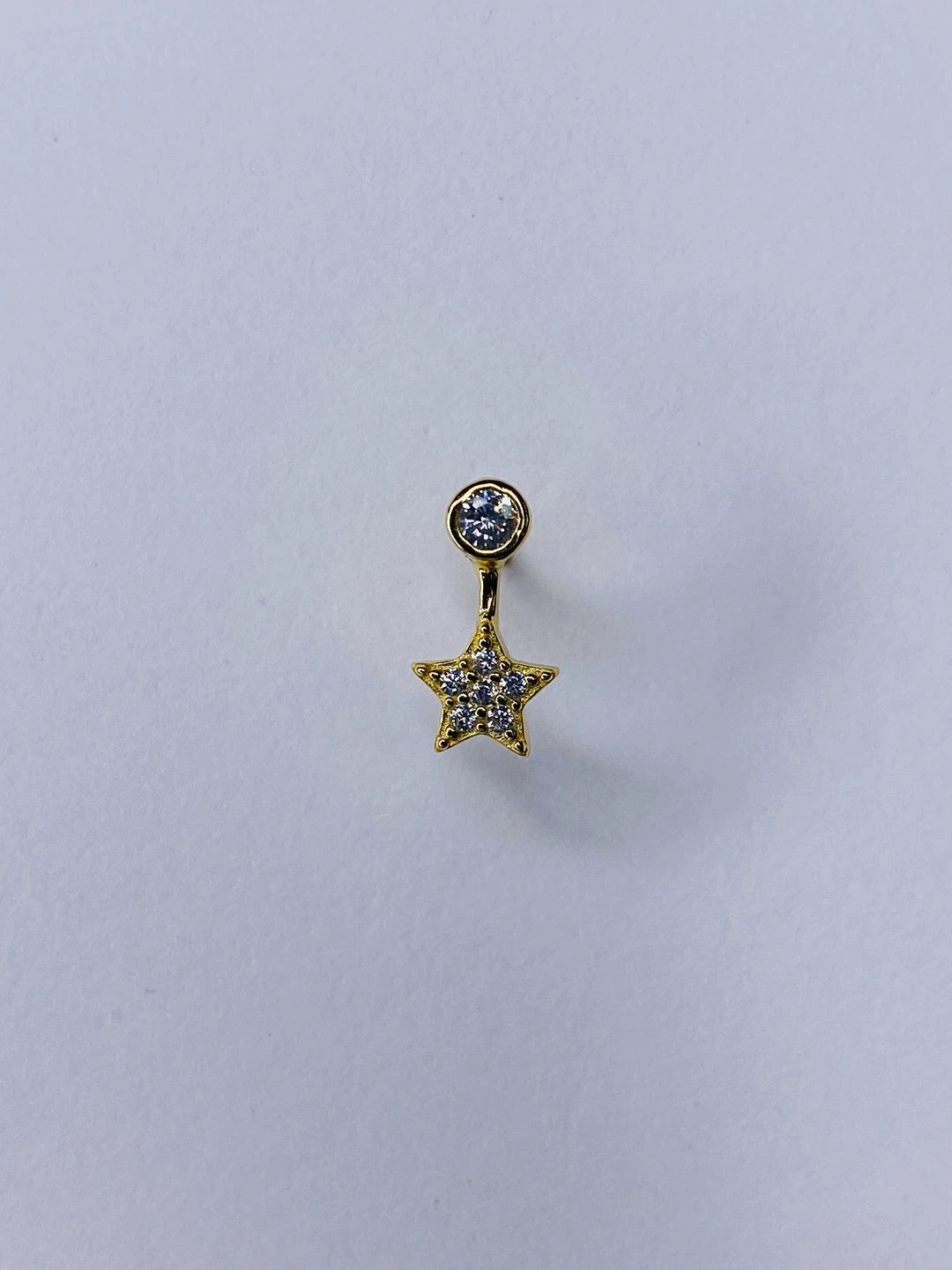 Sterling silver pave set cubc zirconia star/round bezel stud. 1/2″ tall. 14k gold plate or rhodium plate.