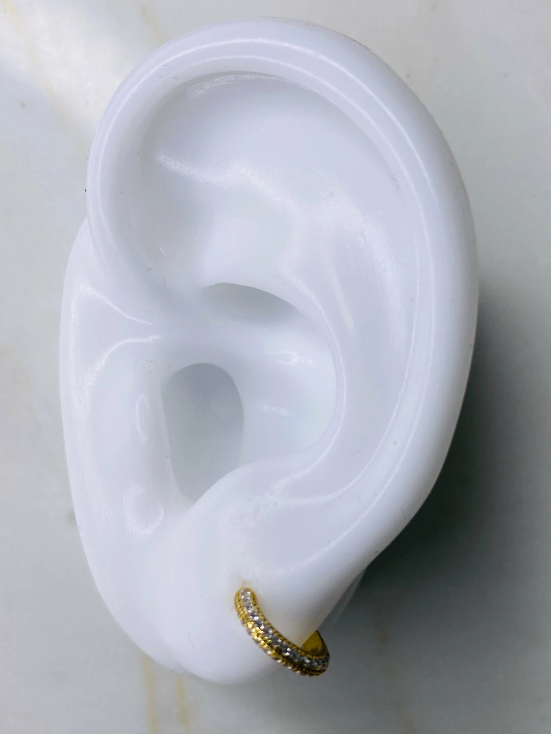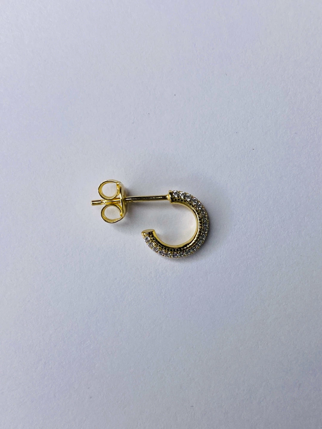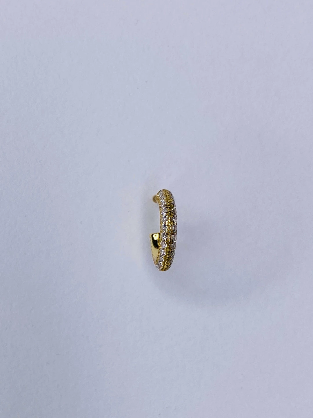 Sterling silver micro pave set cubic zirconia open hoop stud. 3/8″ diameter. 14k gold plate or rhodium plate.