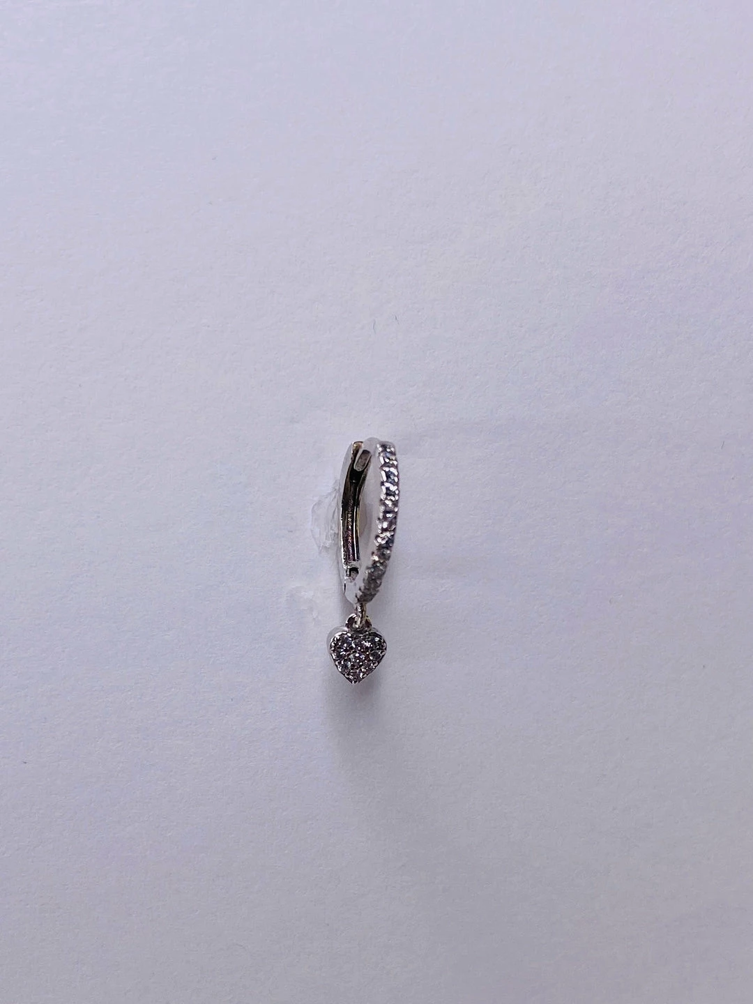 Sterling silver huggy hoop stud pave set cubic zirconia with dangle heart. 1/2″ diameter x 3/4″ long Hinged for easy on/off. 14k gold plate or rhodium plate