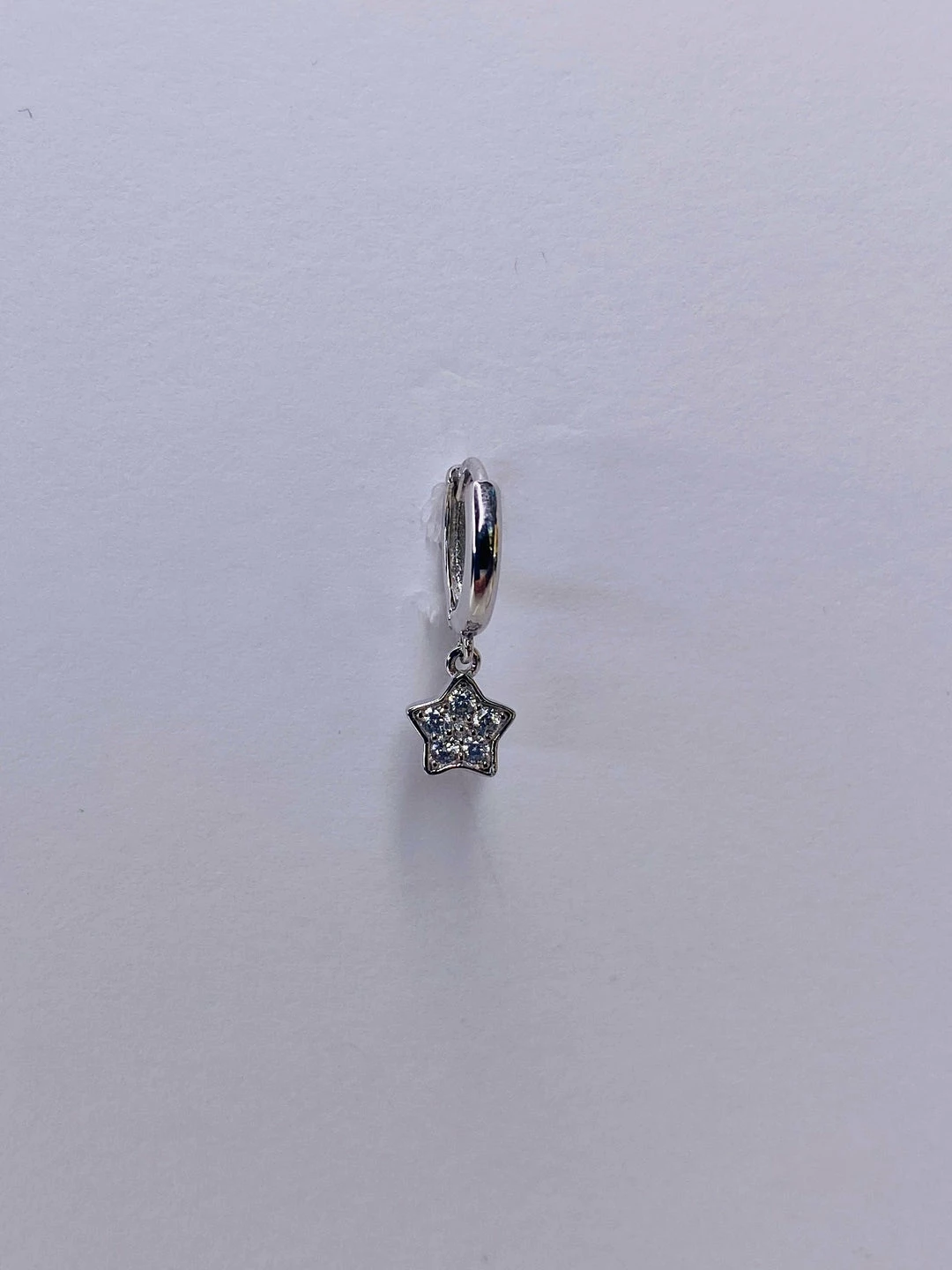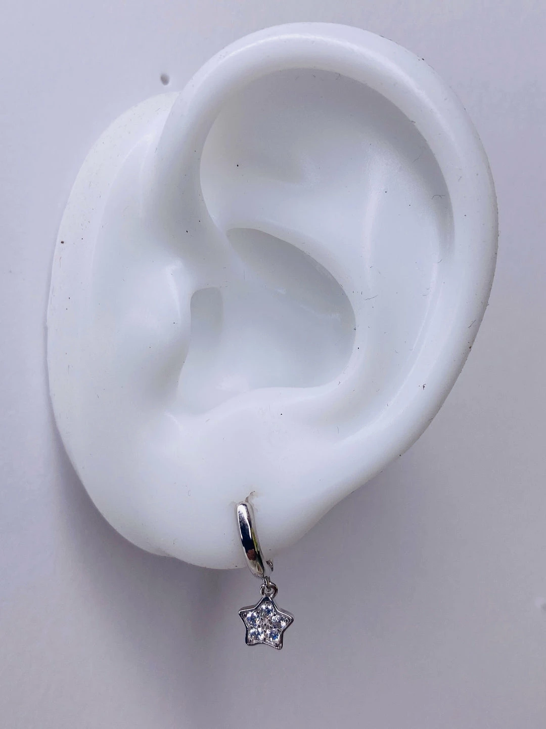 Sterling silver huggy hoop stud pave set cubic zirconia with dangle star. 1/2″ diameter x 3/4″ long Hinged for easy on/off. 14k gold plate or rhodium plate