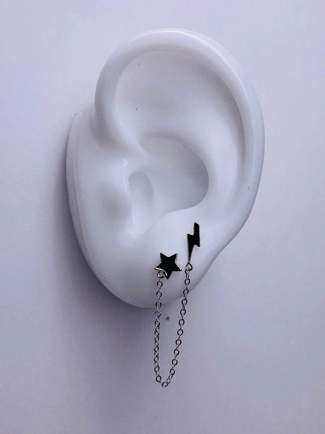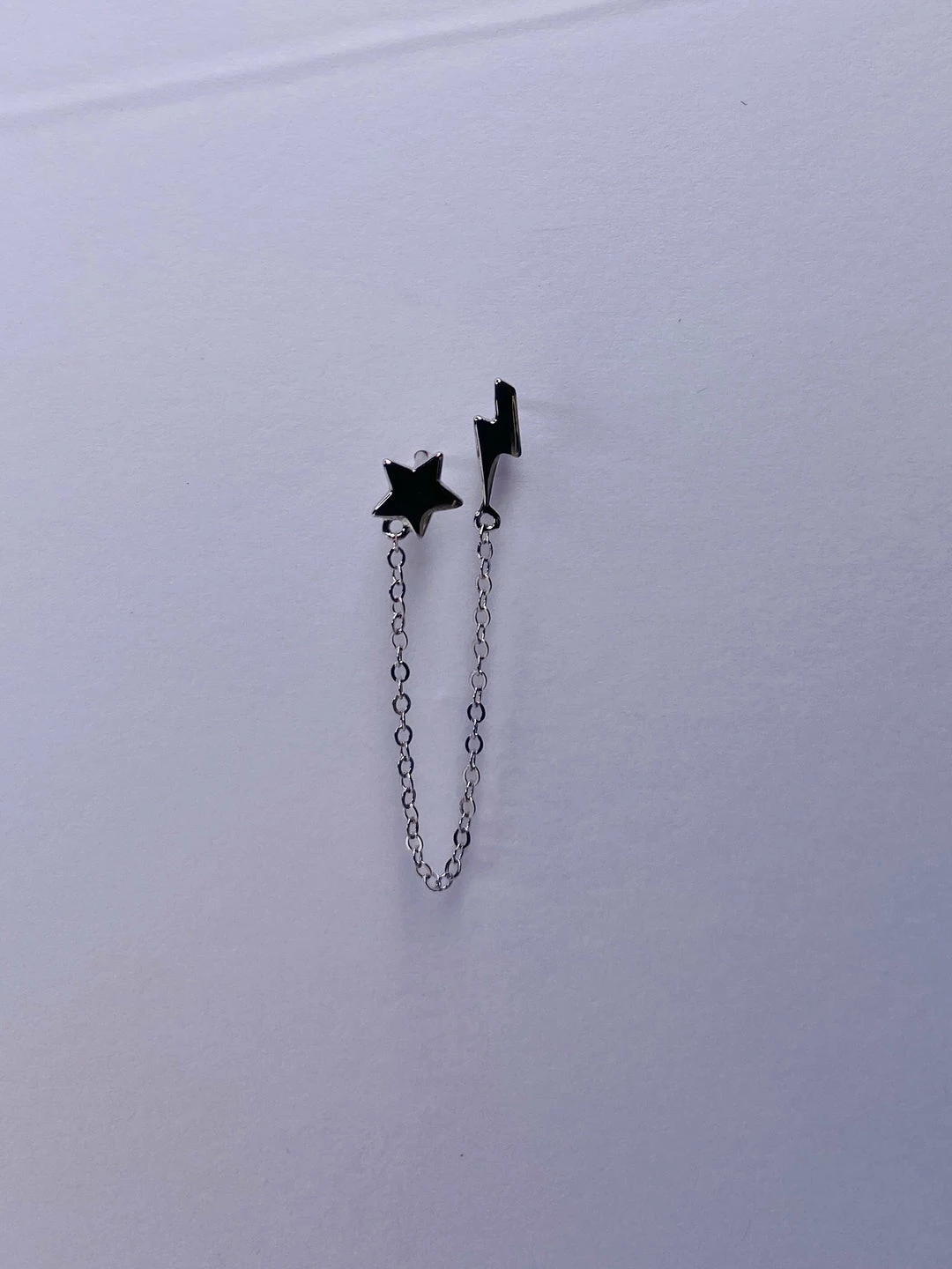 Sterling silver double star/bolt earring stud connected with cable chain detail. 1 1/4″ long. 14k gold/rhodium plate.