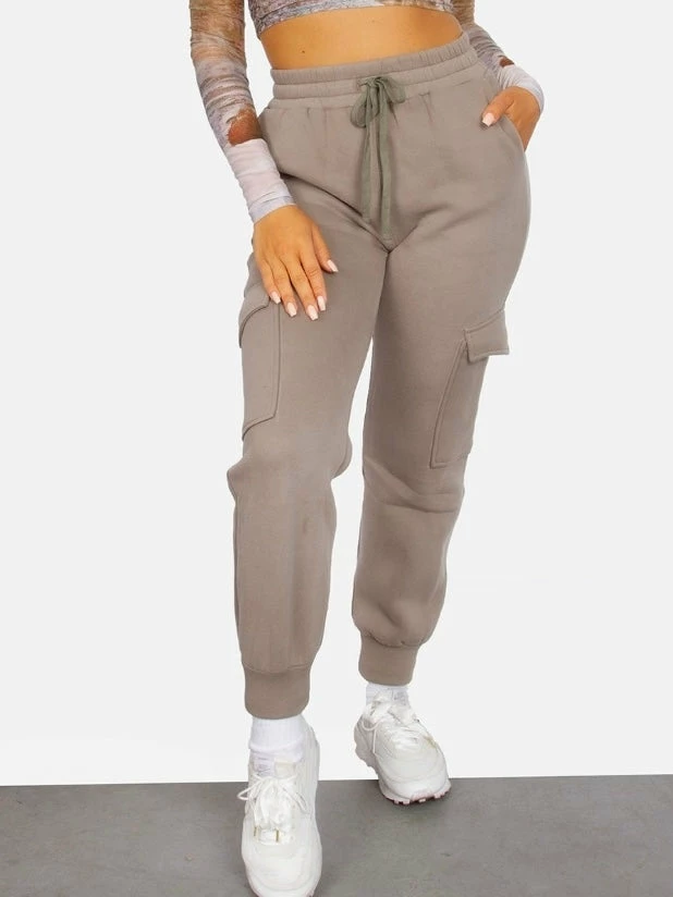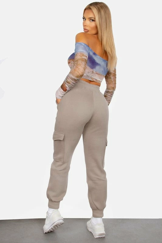 Drawstring high waist, tapered ankle, slim leg with side cargo pockets.