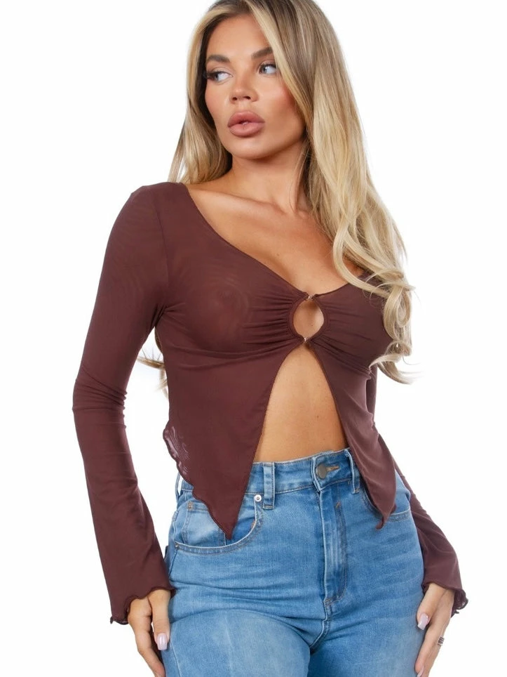 Long sleeve mesh crop top with two button closure.