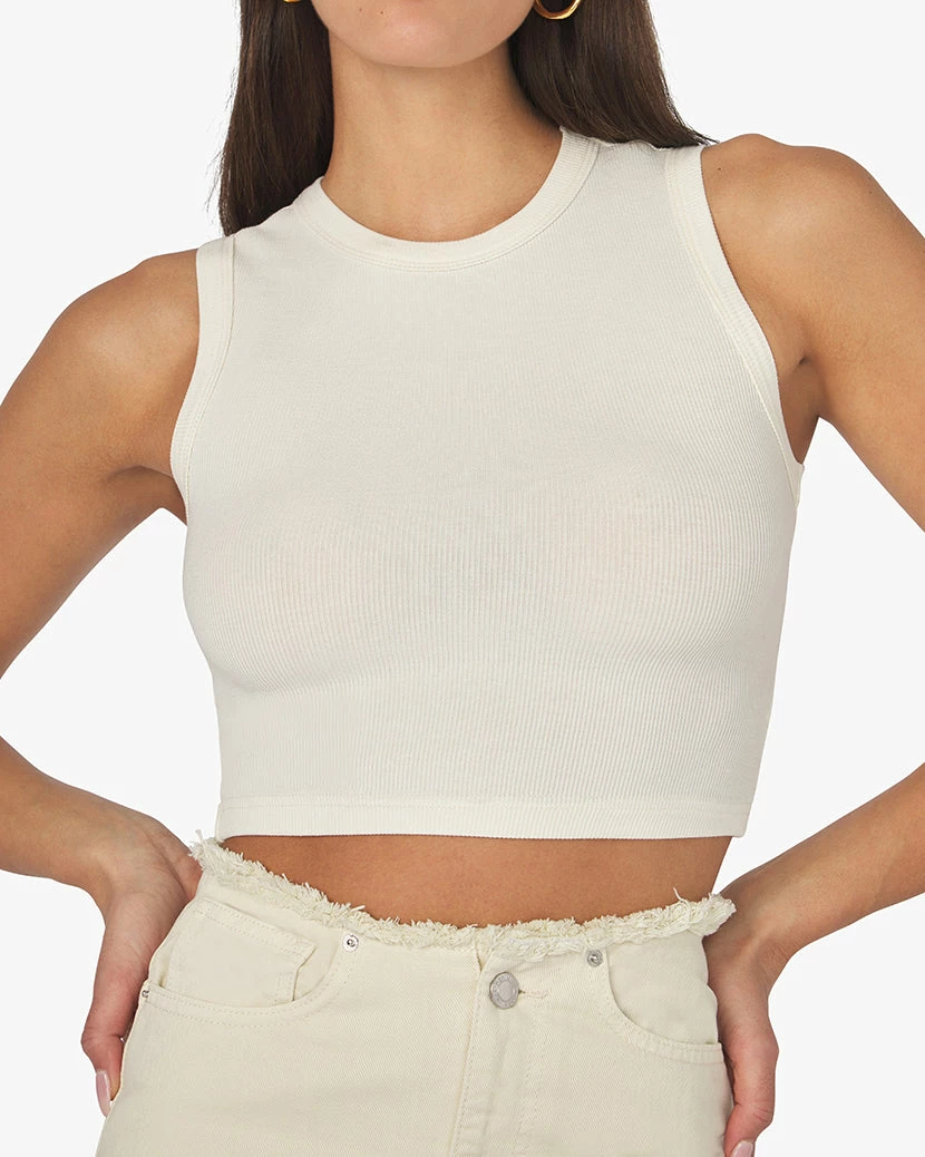 Between the cropped length and the fitted shape, the Muscle Tank makes for an understated layer that’s easy to style. It’s made from stretch ribbed-knit fabric, refined with crisp finishes along the edges.