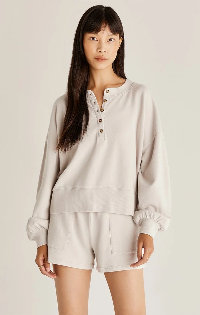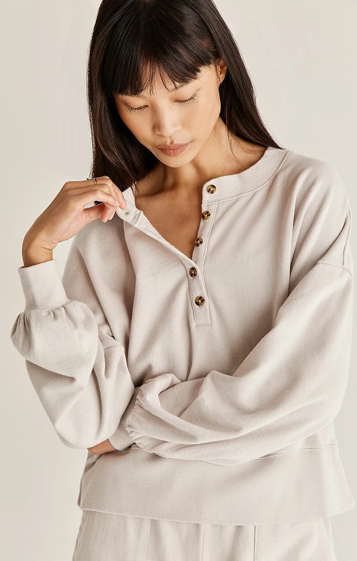 You will feel as good in our Hana Henley Sweatshirt. Made in our signature Cotton French Terry fabric and featuring button plackets at the neck and a thick ribbed hem.